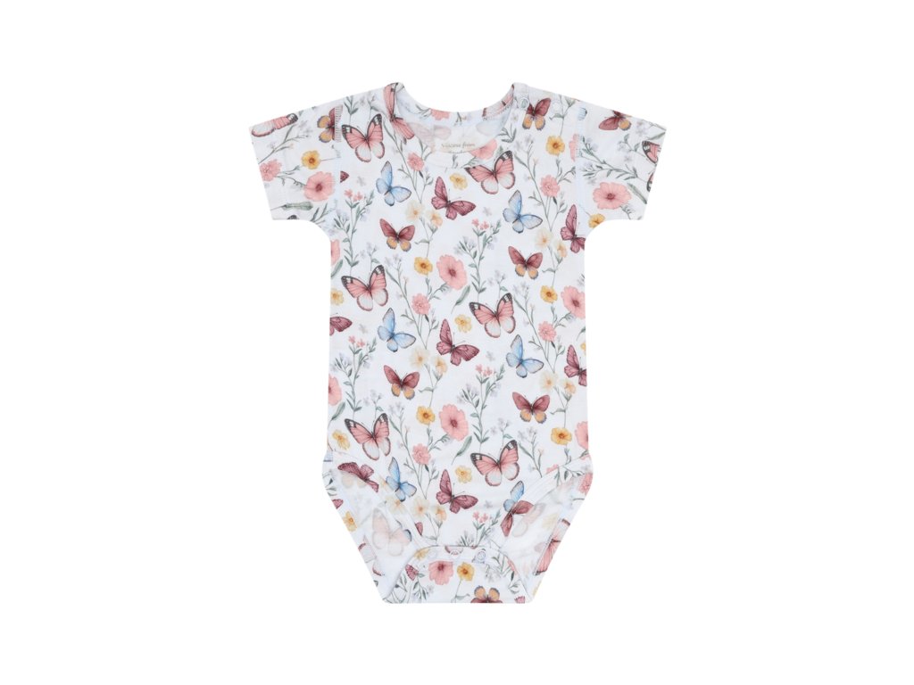 Bambusové body Hust and Claire krátký rukáv louka s motýlky na sv.modré