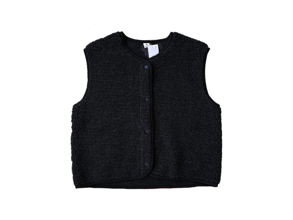Vesta je oversized střihu. Délka sahá cca po boky, v závislosti na výšce postavy a velikosti. Zapínání je na druky. Vesta je bez kapes.