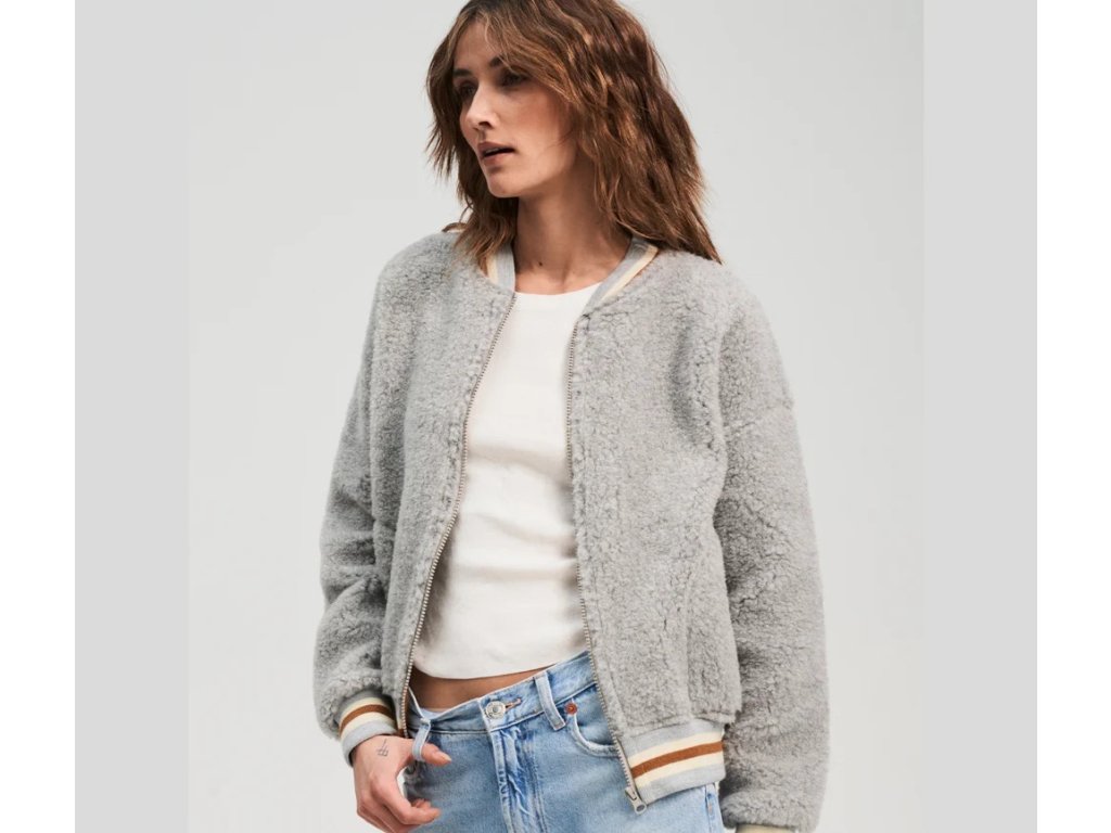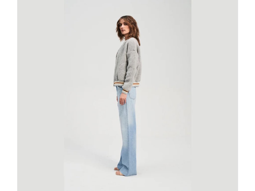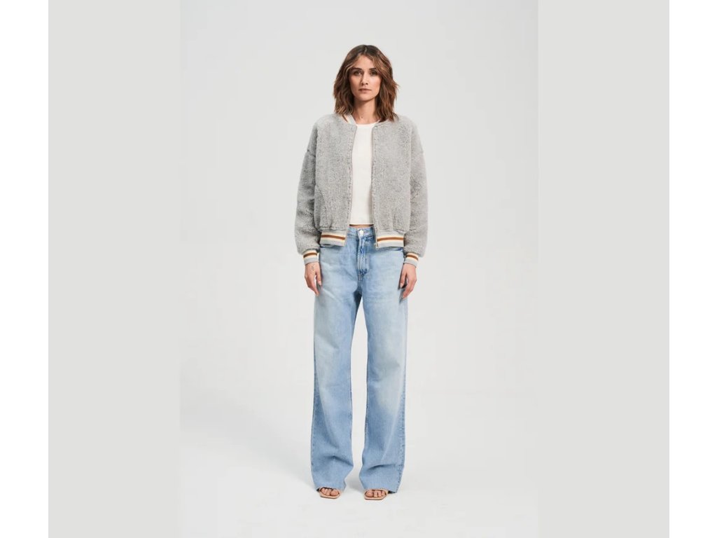 Lehký vlněný beránek z certifikované organické vlny. Bunda má dvě boční kapsy, zapínání na zip a v pase a na koncích rukávů je zakončení pružným lemem. Střih bundičky je lehce oversized se spadnou linií ramen.